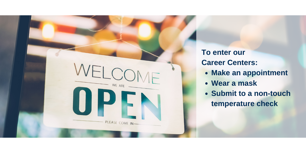 Our virtual services are still available and you can meet with a career coach over the phone, email or by online applications like Zoom. Also, check out our virtual workshops, you can find them here.